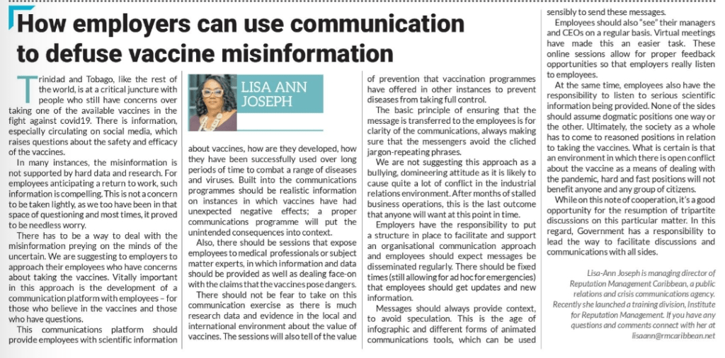 How employers can use communication to defuse vaccine misinformation admin September 3, 2021 RMC Articles/Columns 0 Comments Thursday 5th August, 2021https://newsday.co.tt/2021/08/05/how-employers-can-use-communication-to-defuse-covid19-vaccine-misinformation/ Post navigation Previous Previous post: Connecting the points in what you want to say about your businessNext Next post: Communications to deal with the next normal Leave a Reply Cancel replyYour email address will not be published. Required fields are marked *Comment * Name * Email * Website Save my name, email, and website in this browser for the next time I comment.